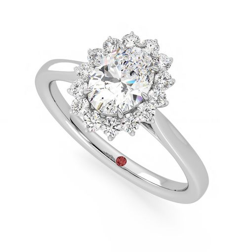 Oval diamond centre and floral diamond halo engagement ring set in 18ct white gold