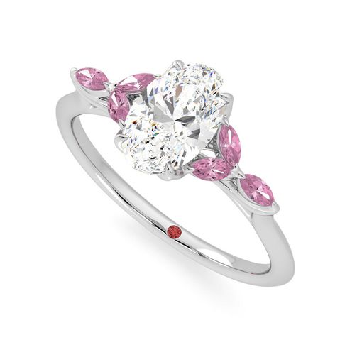 Oval centre engagement ring with marquise pink sapphire petals on a knife edge band
