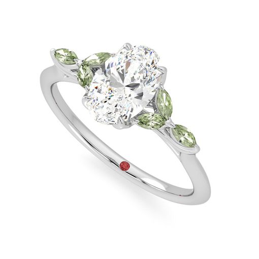 Oval centre engagement ring with marquise green sapphire petals on a knife edge band