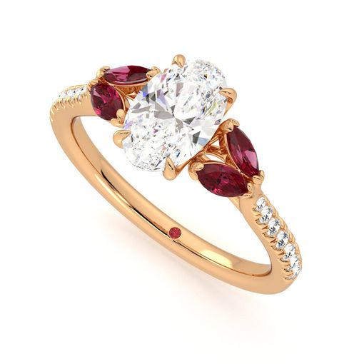 Oval centre engagement ring with marquise rubys set on a diamond pavé 18ct rose gold band
