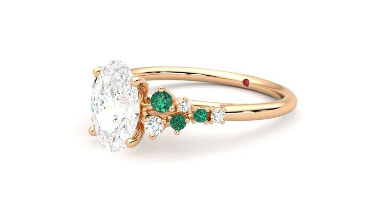 Oval centre framed by round emerald and diamond clusters engagement ring set in 18ct rose gold