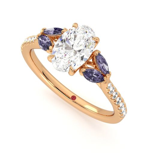 Oval centre engagement ring with marquise purple sapphires set on a diamond pavé 18ct rose gold band