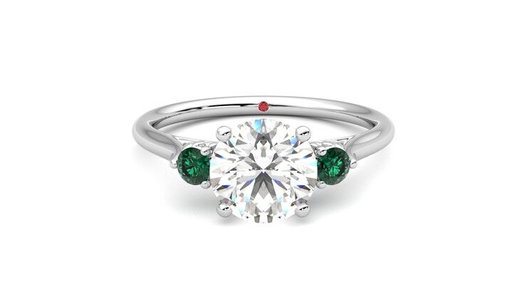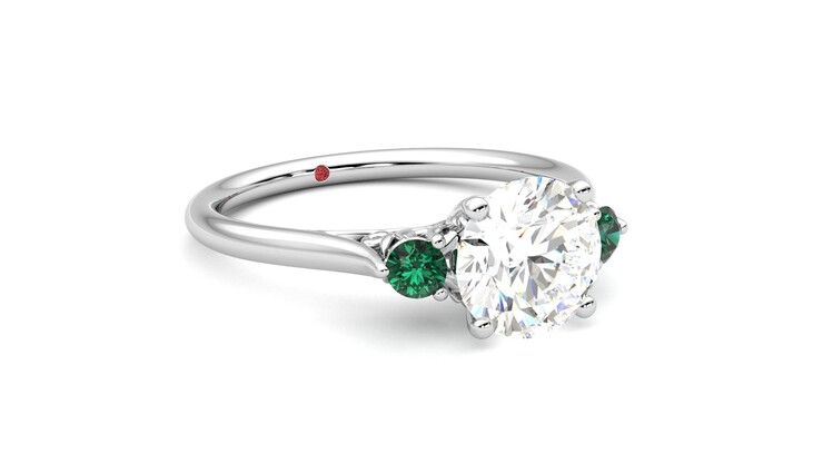 Round diamond trilogy with filigree basket engagement ring set in platinum and emerald sides