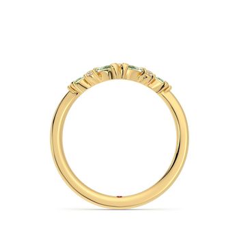 Curved wishbone wedding ring with diamonds and marquise green sapphires set in 18ct yellow gold