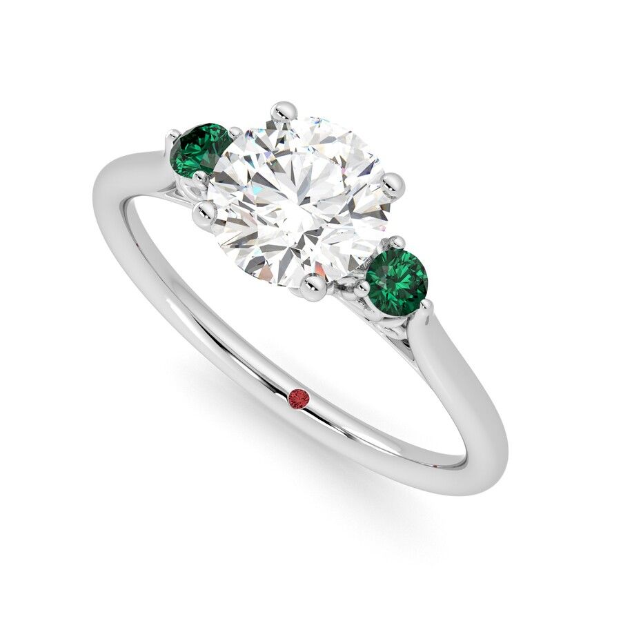 Round diamond trilogy with filigree basket engagement ring set in 18K white gold and emerald sides